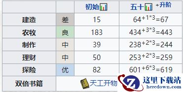 初始属性:建造15,农牧183,制作39,理财50,探险82。