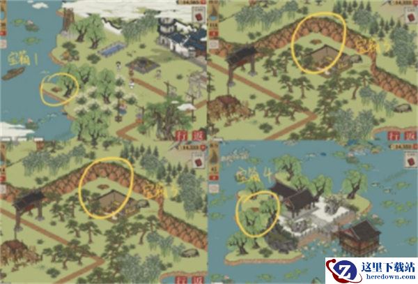4.宝箱4:在一个岛上,有一个亭台,后来需要砍掉一些柳树