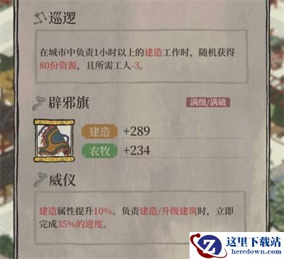 3.它的专属珍宝是辟邪旗,可以给建造增加289,农牧增加234