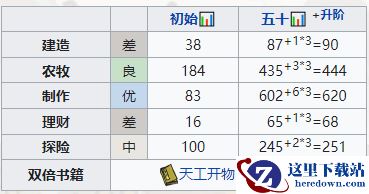 初始属性:建造38,农牧184,制作83,理财16,探险100。