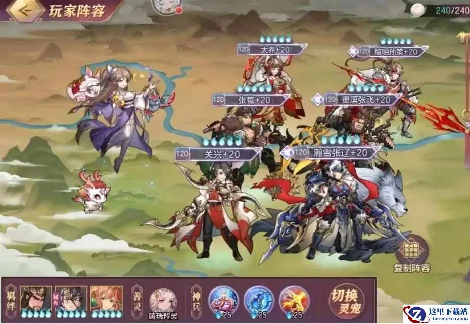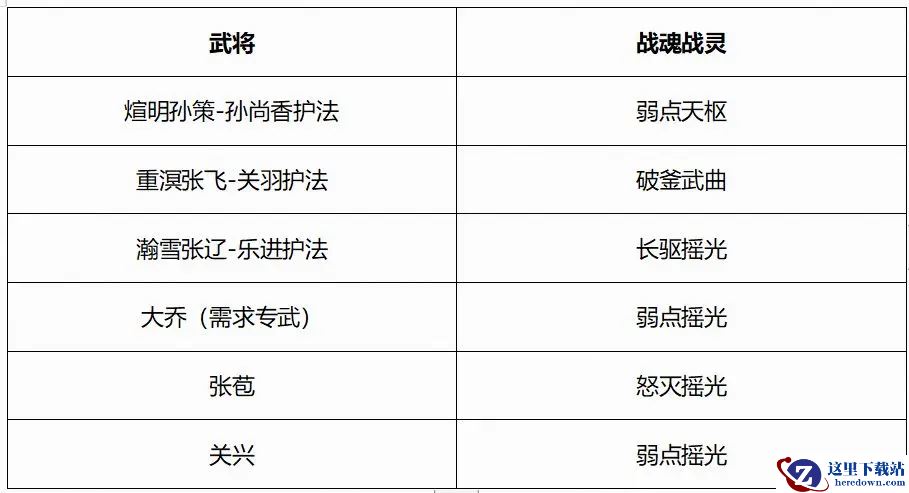 武将:煊明孙策-孙尚香护法、重溟张飞-关羽护法、瀚雪张辽-乐进护法、大乔(需求专武)、张苞、关兴
