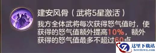 略有小成:怒攻时,降低目标10%最终减伤,最多可叠加3层,持续至战斗结束。觉醒1级效果提升至:[建安风骨]可以使获得的怒气值额外提高18%,额外获得的怒气值不超过120点。