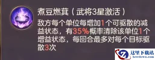 炉火纯青:煮豆燃其效果提升至:敌方每个单位每增加1个可驱散的减益状态,有50%概率清除该单位2个增益状态,每回合每个武将最多发6次。