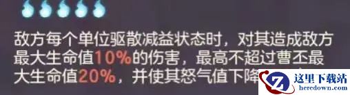 神乎其技:自身受到反弹伤害降低100%。觉醒5级效果提升至:敌方每个单位驱散减益状态时,对其造成敌方最大生命值15%的伤害最高不超过曹不最大生命值30%,并使其怒气值下降200点。