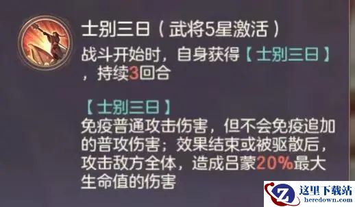 略有小成:[士别三日]无法被驱散,持续时间内受到来自敌方武将的所有伤害降低30%(从15%提升到30%);[士别三日]下遭受普攻时,100%概率(90%提高到100%)对攻击方施加[迟缓],会使目标普攻时额外消耗300点怒气。