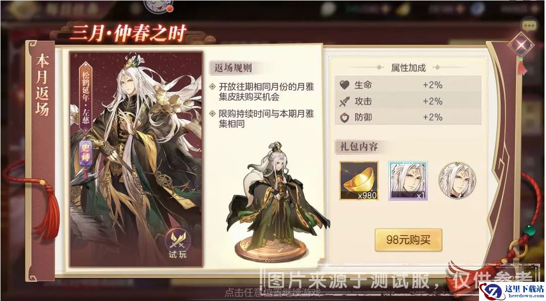小将军可以通过每个月度完成“每日任务”获取月雅集进度,将解锁额外的“月雅集”标准奖励。另外,68元付费解锁“月雅集豪华版”后,达成指定等级可额外获得每月限定史诗级皮肤、主题奖励(本月为唤魂招募券)等资源,助力小将军闪耀三国! 同时,月雅集皮肤常驻返场将更换为松鹤延年·左慈!