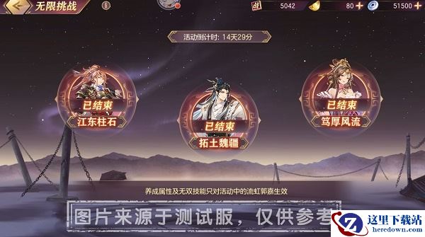 1.在活动的第1日,第3日,第5日将分别开启【江东柱石】、【拓土魏疆】、【笃厚风流】三个阶段的无限挑战。