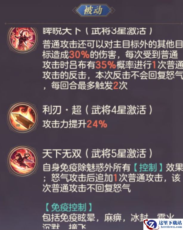 首先“业火”在判定上等同于“灼烧”,因此可以与本技能发生联动。这个效果能够为我方提供1回合/次的高额普攻伤害加成,而且具备非常可观的增幅系数,同时很明显也是为了配合普攻型武将,但是最大的限制在于增幅次数只有一次,这就对单次普攻的基础伤害提出了要求,而且“需要先释放怒攻”的限制条件也使得姜维无法享受加成,吕布是目前最适合本效果的武将,但是吕布的单次普攻伤害明显还不足以一击致命。