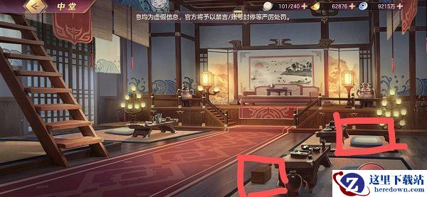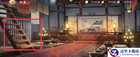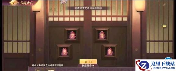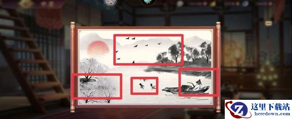 点击中堂的楼梯,进入后将秤砣放进去,按照左上鱼,右上老翁,左下树,右下鸟就可以打开房门。