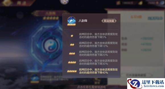阵法:八卦阵是性价比最高的阵容,锋矢与鹤翼优先级较低。八卦能减少伤害甚至真伤以及百分比伤害,而锋矢无法第一回合触发并不契合灭队,因此无论抗队灭队都先拉满八卦阵(八卦可以被清阵,可以点个一星锋矢减少八卦被清除的概率)