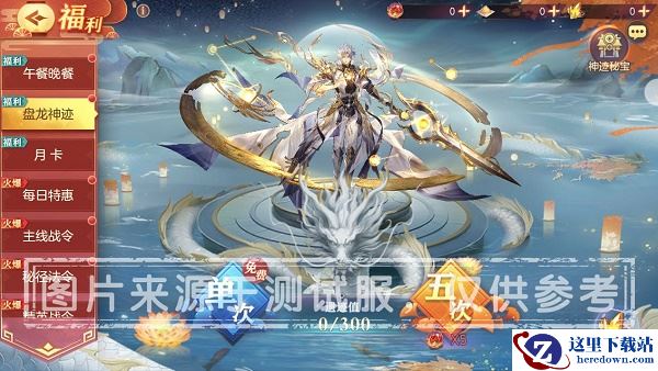 2.通过主界面右上角【福利】即可前往“盘龙神迹”,可每日免费祈福1次或消耗「龙珠」祈福,每次祈福将提升1点【神迹值】并随机获得一份“神迹馈赠”。累计【神迹值】达到300,即可获得珍稀道具「龙魂水晶」,可用于兑换当期传说级魂将皮肤。