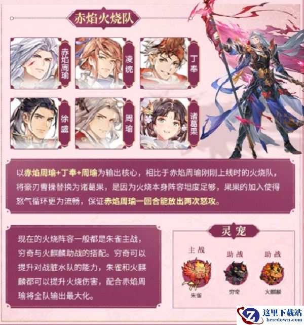 1.以赤焰周瑜+丁奉+周瑜为输出核心,相比于赤焰周瑜刚刚上线时的火烧队,将豪刃曹操替换为诸葛果,是因为火烧本身阵容坦度足够,果果的加入使得怒气循环更为流畅,保证赤焰周瑜一回合能放出两次怒攻。