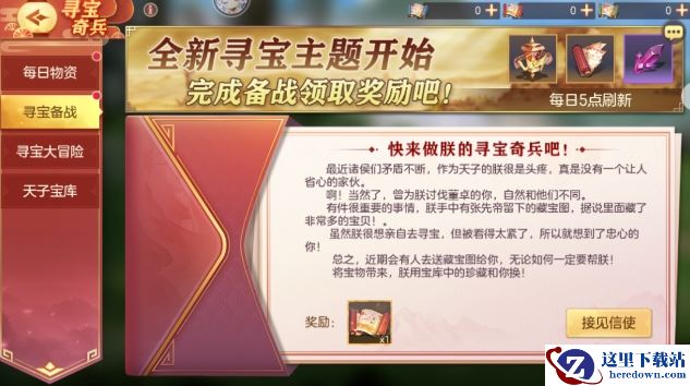 接见信使后,开启寻宝备战任务。每日完成讨伐魔将、家园互动、群雄逐鹿等玩法条件即可获得西凉藏宝图碎片及初级神锻石、中级神锻石、紫神兵碎片任选、橙神兵碎片任选等奖励。