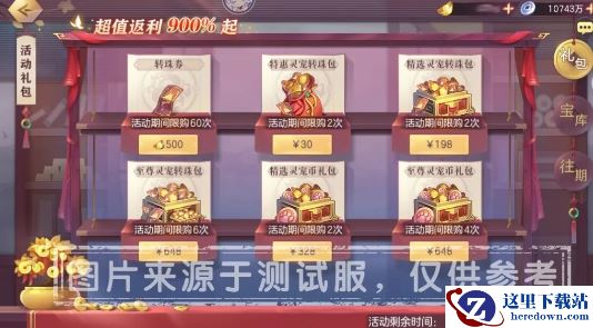 至尊灵宠转珠包:内含转珠券*45,元宝*6480,售价648元,活动期间限购6次