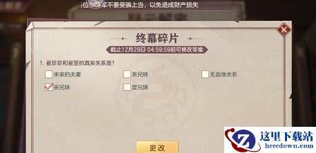 《三国志幻想大陆》游戏中疑云解密终幕碎片问题是“崔珍珍和崔昱的真实关系是什么”,正确答案就是亲兄妹。那么今天小编就给大家介绍一下三国志幻想大陆疑云解密终幕碎片答案分享,有需要的小伙伴不要错过了。