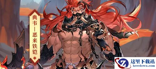 标志性的一头红发与赤裸的古铜色皮肤表现出典韦狂放不羁的性格,脸上的盔甲配以锋利的角,仿佛獠牙一般更加凸显凶恶的气息,原本的恶来铁戟现在用一条铁锁捆缚在一起,挥舞时更加得心应手,显得更为凶狠霸道。