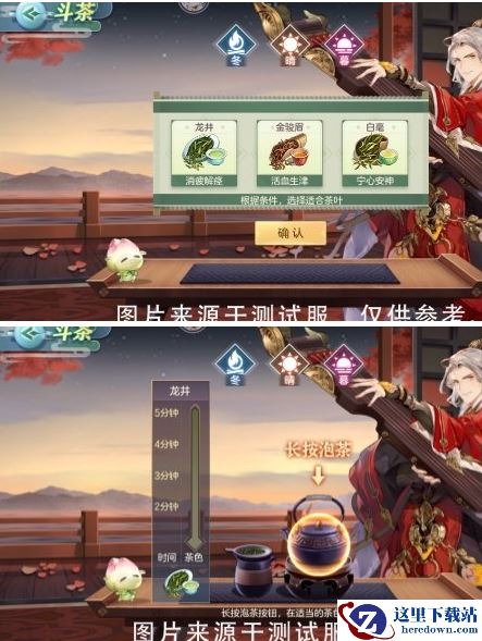 通过判断“季节”、“天气”、“昼夜”等条件因素选择合适的茶品,并通过控制“泡茶时间”力求为随机武将呈上浓淡相宜的茶品,即可获取评分对应的活动货币「茶晶」与元宝奖励!
