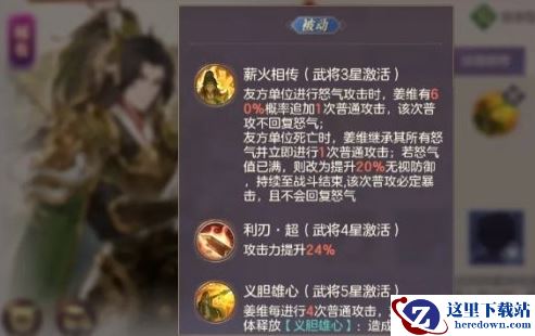 B.友方武将怒攻,可触发姜维普攻,即友军的高频怒攻可有效提高姜维普攻次数,进而触发【义胆雄心】造成爆炸输出的同时,吸取大量生命以保证自身的生存。在此机制之下,若想使姜维最高效的发挥其输出能力,通过合理搭配武将,让其迅速获取怒气,多次触发普攻,则为上策。一旦姜维怒气滚雪球起来之后,便可完成爆发,迅速击灭敌阵。经过前辈们的勤奋钻研,姜维目前已经成为了首屈一指的C位担当。
