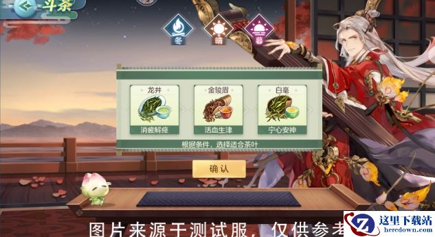 通过判断“季节”、“天气”、“昼夜”等条件因素选择合适的茶品,并通过控制“泡茶时间”力求为随机武将呈上浓淡相宜的茶品,即可获取评分对应的活动货币「茶晶」与元宝奖励!