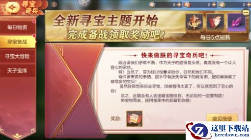 接见信使后,开启寻宝备战任务。每日完成讨伐魔将、家园互动、群雄逐鹿等玩法条件即可获得西凉藏宝图碎片及初级神锻石、中级神锻石、紫神兵碎片任选、橙神兵碎片任选等奖励。
