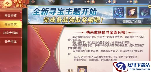 活动期间登录即可接见信使一次,接见信使后可获得辽东藏宝图*1,可用于寻宝大冒险!接见信使后,开启寻宝备战任务。每日完成组队讨伐、家园互动、群雄逐鹿等玩法条件即可获得辽东藏宝图碎片及元素碎片、随机一阶灵石等奖励。