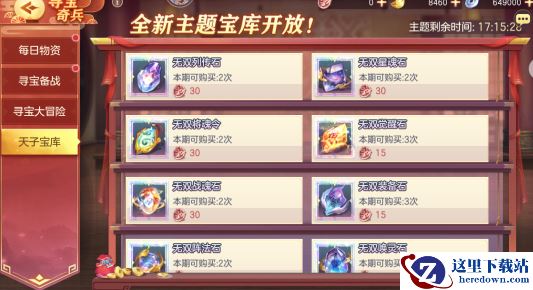 使用寻宝奖章即可兑换无双将魂令、无双唤灵石、无双觉醒石、无双战魂石、无双阵法石、体力食盒、稀有三阶灵石任选、普通三阶灵石任选等多种资源!