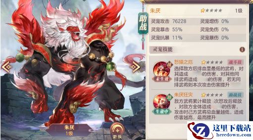 灵宠定位:朱厌的上阵能够强有力的威慑敌方后排输出,对敌方后排带来巨大威胁。