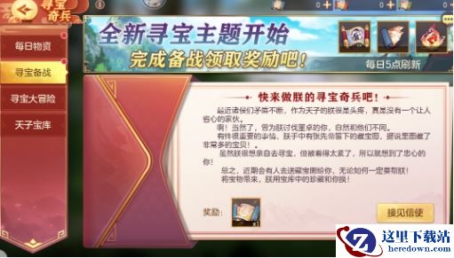 接见信使后,开启寻宝备战任务。每日完成讨伐魔将、家园互动、群雄逐鹿等玩法条件即可获得江南藏宝图碎片及将魂精华、随机良将将魂、随机名将将魂、三顾茅庐券等奖励。