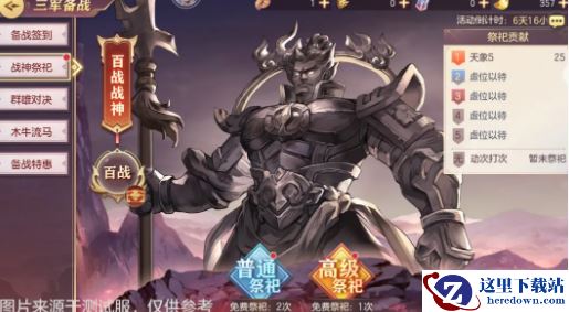 活动期间,开启战神祭祀,每日可免费普通祭祀2次,高级祭祀1次。普通祭祀可以获得荣誉勋章,高级祭祀可以获得会武币,天下会武和群雄逐鹿,都可以获得祭祀道具:黄酒、青梅酒。青梅酒每日最多获取5份,黄酒每日最多获取10份。战神祭祀共有六个阶段,分别为“百战战神”“无双战神”“传奇战神”“绝世战神”“不朽战神”“封狼居胥”。全服祭祀战神,达到对应的等级可以获得对应的道具,内含二级随机灵石、三级随机灵石、木牛机关匙。全服祭祀达一定阶段即可进阶下一阶段战神祭祀。