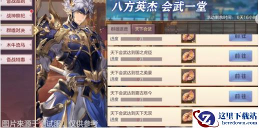 活动期间,开启群雄对决,完成群雄逐鹿或天下会武各项任务目标,即可领取丰厚奖励。群雄逐鹿:完成群雄逐鹿战斗场次,可以获得对应的荣誉勋章奖励。群雄逐鹿达到对应的段位,可以获得对应的木牛机关匙。天下会武:完成天下会武挑战场次,可以获得对应的会武币,天下会武达到对应的段位,可以领取对应的木牛机关匙。