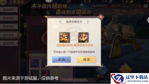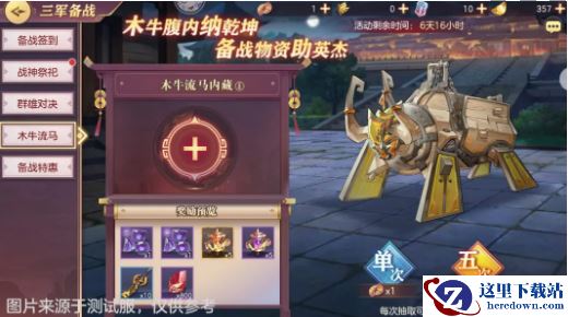 木牛腹内纳乾坤,山河物资备三军。活动期间,开启木牛流马活动,可消耗木牛机关匙抽取备战物资,备战物资包含稀有道具自选:四阶随机灵石*1或橙神兵碎片任选*60,以及二阶随机灵石、三阶随机灵石、橙色神兵碎片任选、紫色神兵碎片任选、精炼石等奖励。