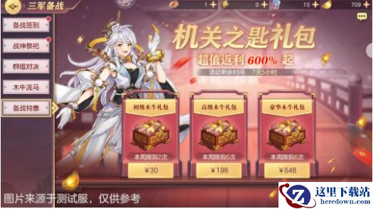 活动期间,上线备战特惠礼包,超值返利600%起!初级木牛礼包:内含木牛机关匙*5、元宝*300,售价30元,限定超值返利600%!本周限购2次。高级木牛礼包:内含木牛机关匙*20、元宝*1980,售价198元,本周限购6次。豪华木牛礼包:内含木牛机关匙*60、元宝*6480,售价648元,本周限购6次。