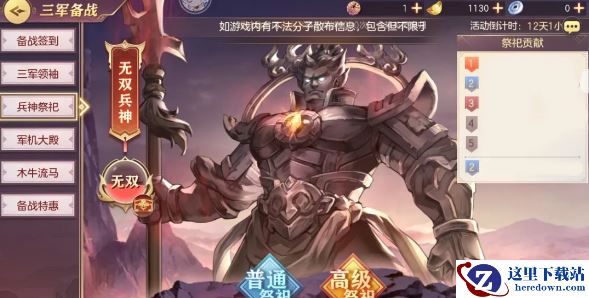 开启兵神祭祀,每日可免费普通祭祀3次,高级祭祀1次。每次祭祀均可获得军章,可用于在问鼎商店中兑换各种道具。个人兵神祭祀积分达到一定点数,即可获得木牛机关匙、军章等奖励。问鼎中原战斗均有概率获得祭祀道具:黄酒、青梅酒。兵神祭祀共有六个阶段,分别为“百战兵神”“无双兵神”“传奇兵神”“绝世兵神”“不朽兵神”“封狼居胥”。全服祭祀兵神,全体玩家获得问鼎中原专属属性加成(伤害加成,伤害减免)。每个兵神均有专属兵神馈赠,内含二级随机灵石、木牛机关匙。全服祭祀达一定阶段即可进阶下一阶段兵神,获得更高加成属性及新的兵神馈赠。