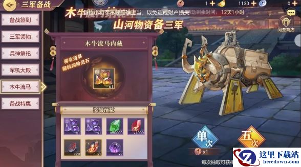 木牛腹内纳乾坤,山河物资备三军。活动期间,开启木牛流马活动,可消耗木牛机关匙抽取备战物资,备战物资包含稀有道具四阶随机灵石,以及二阶随机灵石、三阶随机灵石、兵玉、精炼石、百炼刻印石、中级魂石等奖励。灵石可用于兵符镶嵌,每个兵符可镶嵌四种灵石,为全体上阵武将提供属性加成!