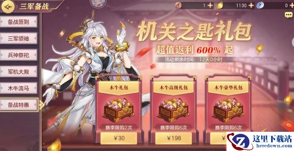 1、木牛特惠礼包:内含木牛机关匙*5、元宝*300,售价30元,限定超值返利1000%!赛季限购2次。