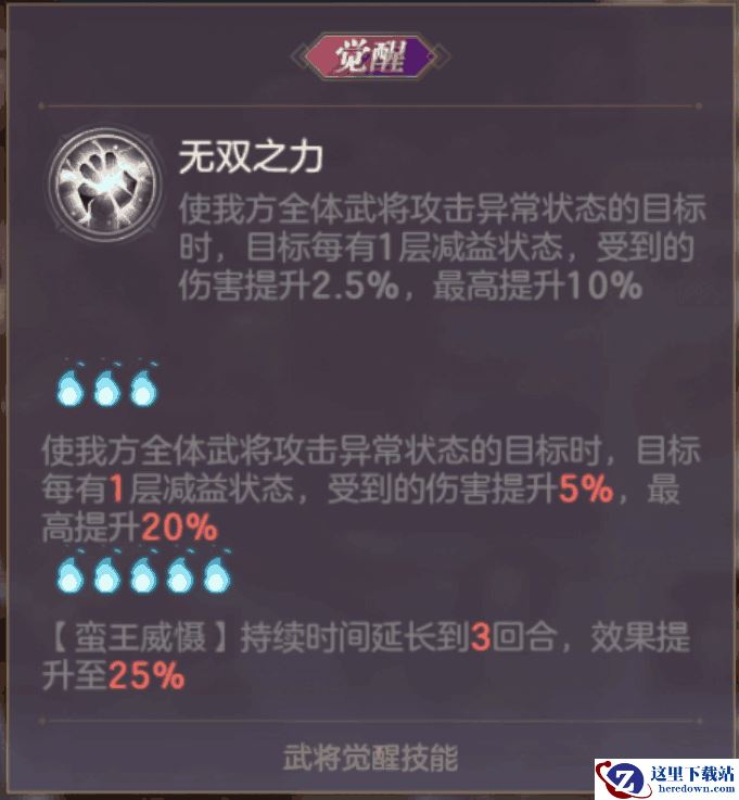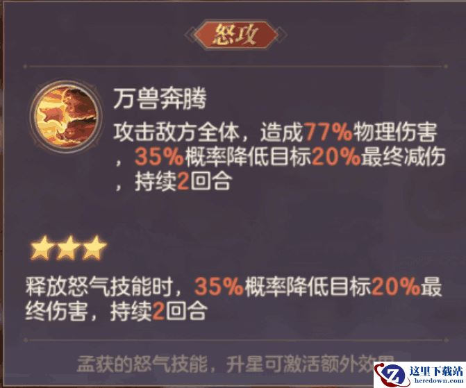 孟获五星以后会在进入战斗时减少敌方全体15%的异常状态抗性,能让己方的灼烧眩晕等效果附加几率提高。
