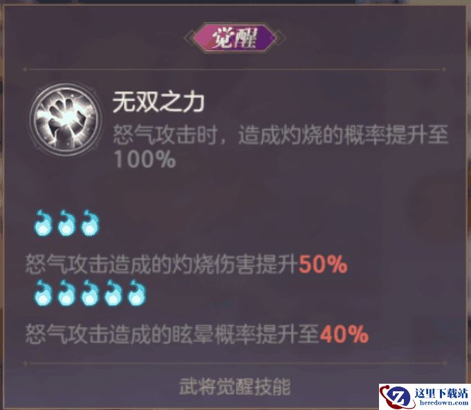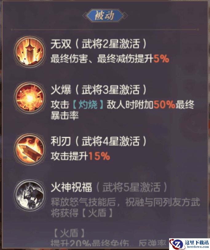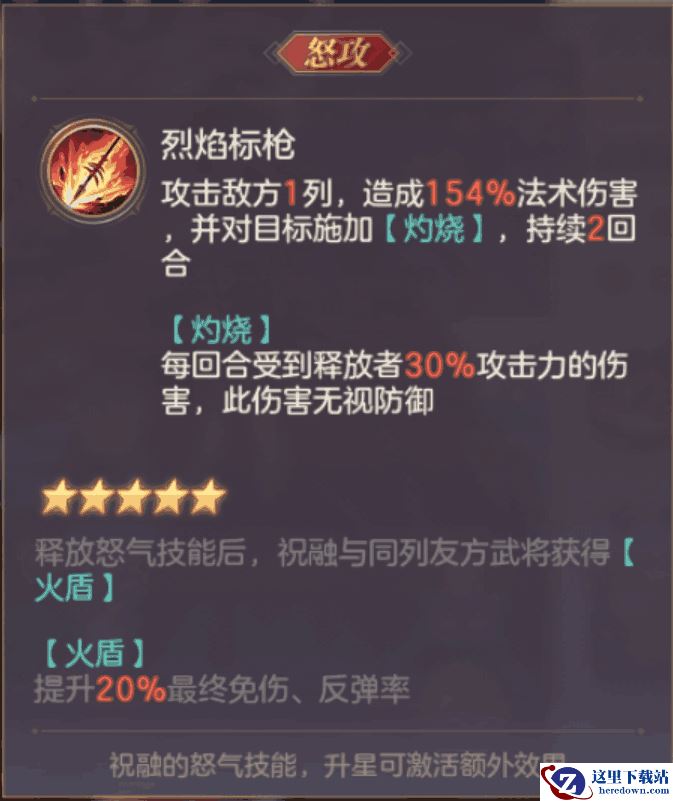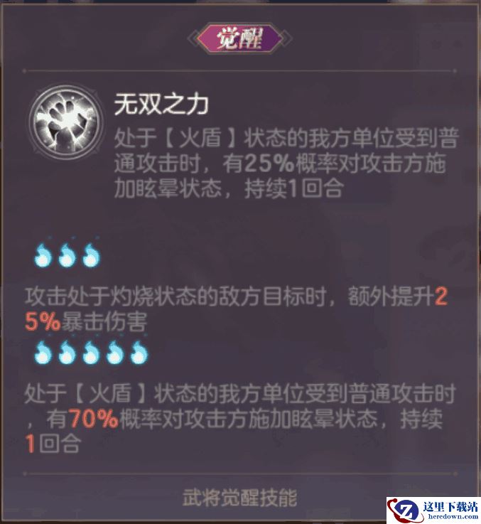 祝融一火以后会让获得火盾的友方单位在被敌方普通攻击后,有25%几率对敌方目标施加一回合的眩晕效果。在三火之后还会提升对灼烧单位的暴击伤害。