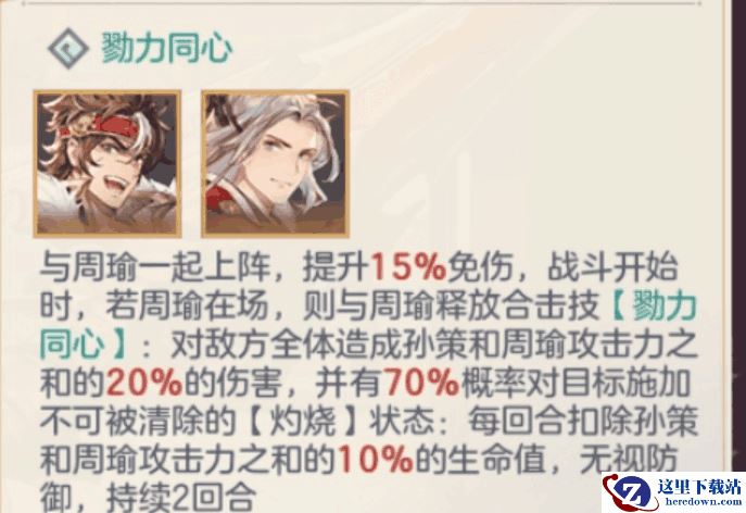 孙策周瑜组成的羁绊戮力同心会在战斗开始时对敌方造成群体伤害并有70%附加不可被清除的灼烧状态,是阵容之中施加灼烧的主力。
