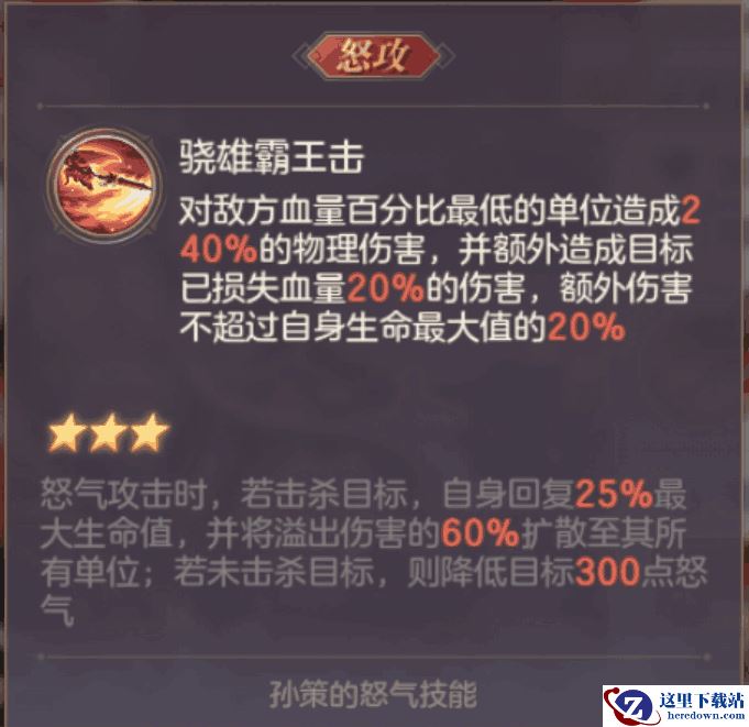 孙策大招附带斩杀效果,作为坦克武将却拥有着不俗的输出能力,在三星后斩杀敌人还附带群体伤害,未斩杀也会降低目标怒气。孙策三星即可,平民玩家无需刻意追星级。