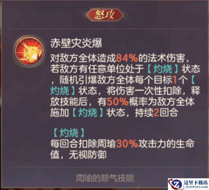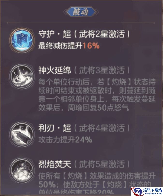 五星周瑜极大的提升了灼烧伤害,并让敌方所有带有灼烧状态的目标降低20%的最终伤害。削弱了敌方输出能力提高了己方的生存能力。