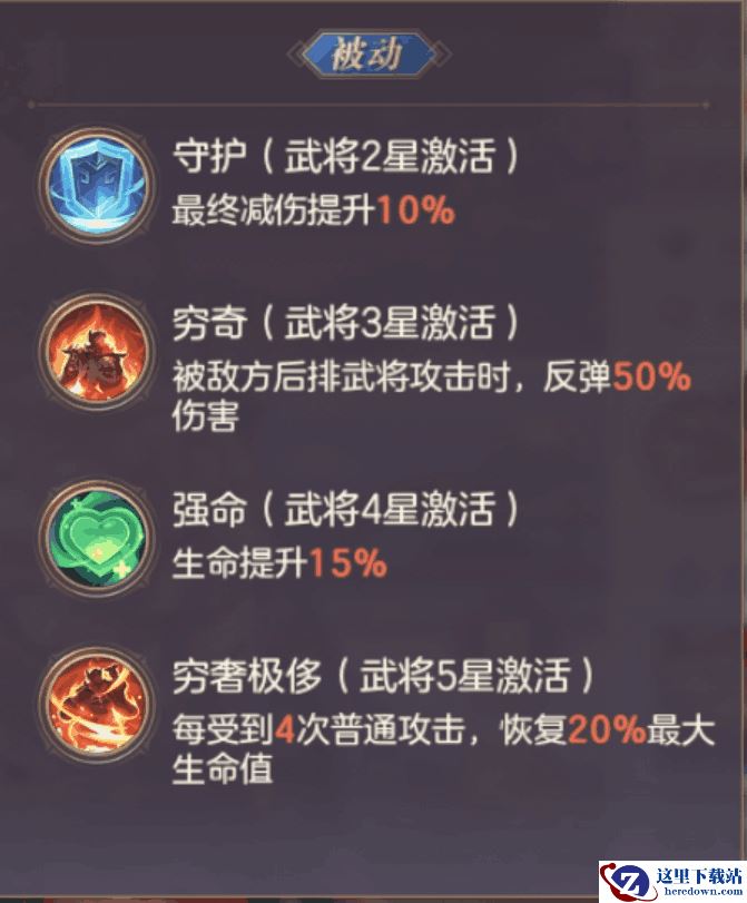 五星董卓解锁的被动技能,能让董卓每受到四次普通攻击后都会回复20%的最大生命值,这个被动能让董卓的生存能力拉满。