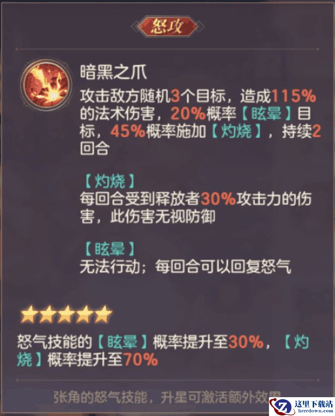 张角的大招会对三个随机目标造成20%的眩晕和45%的灼烧,五星后几率分别提升到30%和70%。