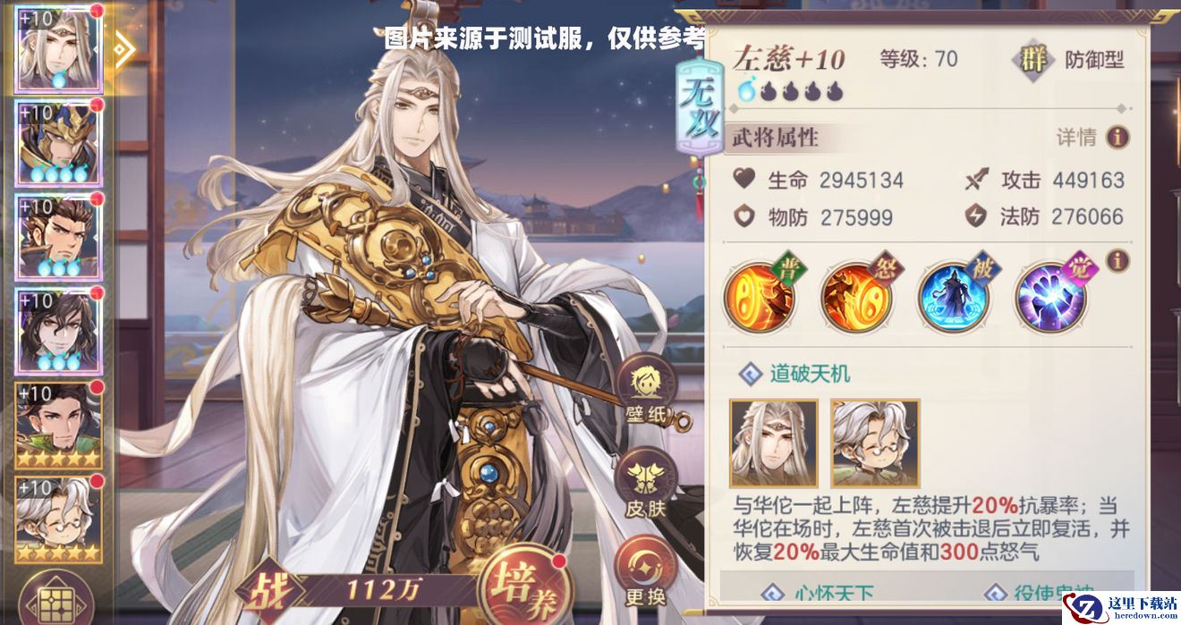 刘备:(1火即可)1火的【无双之力】确保在没有施加上debuff时同样能够达到限制对手的程度。【民心所向】可令队友普攻时回血,配合左慈、曹老板及司马懿的普攻,将全队的恢复力提高了许多。