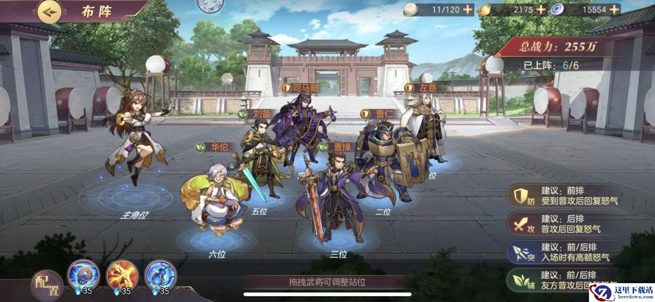 受到普攻进行反击,第三回合起开始,每回合吸取敌方每位武将的怒气值,羁绊【匡正天下】给己方辅助武将回怒,保证了刘备与华佗的怒攻进行多次释放,反击与回怒的特性决定了曹老板在3号位。