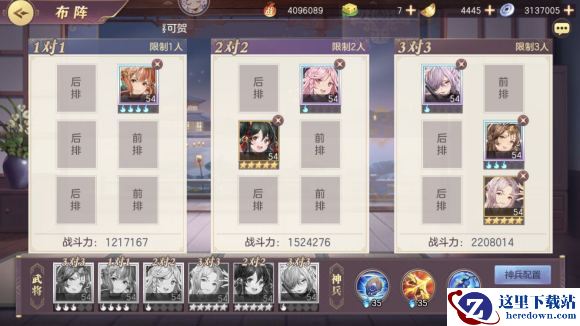 擂台 BOSS 1V1 2V2 3V3 阵容分配 站位 神兵选择: