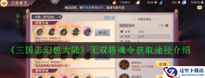 《三国志幻想大陆》游戏中无双将魂令获取途径有哪些?无双将魂令是游戏中非常重要的道具,很多小伙伴不知道无双将魂令的获取方法,那么接下来小编为大家带来《三国志幻想大陆》无双将魂令获取途径介绍,一起来看看吧。
