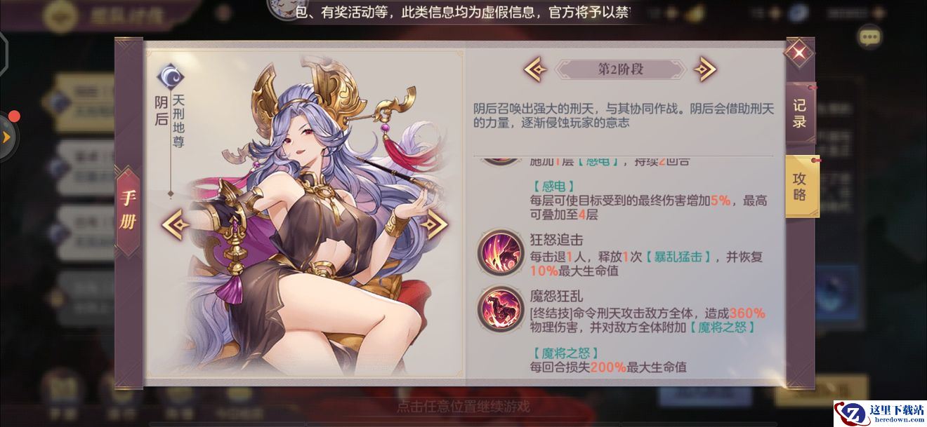 阴后座下是只巨大的刑天,当阴后血量降低到五管以下的时候会进入第二阶段,变身刑天,这里要注意一点,在副本中的阴后,全阶段都有副本2阶段的狂怒追击技能,如果队友不慎被击败,阴后会立刻恢复一管血,并且继续使用暴乱猛击,对我方全体造成伤害,这样就很容易滚雪球
