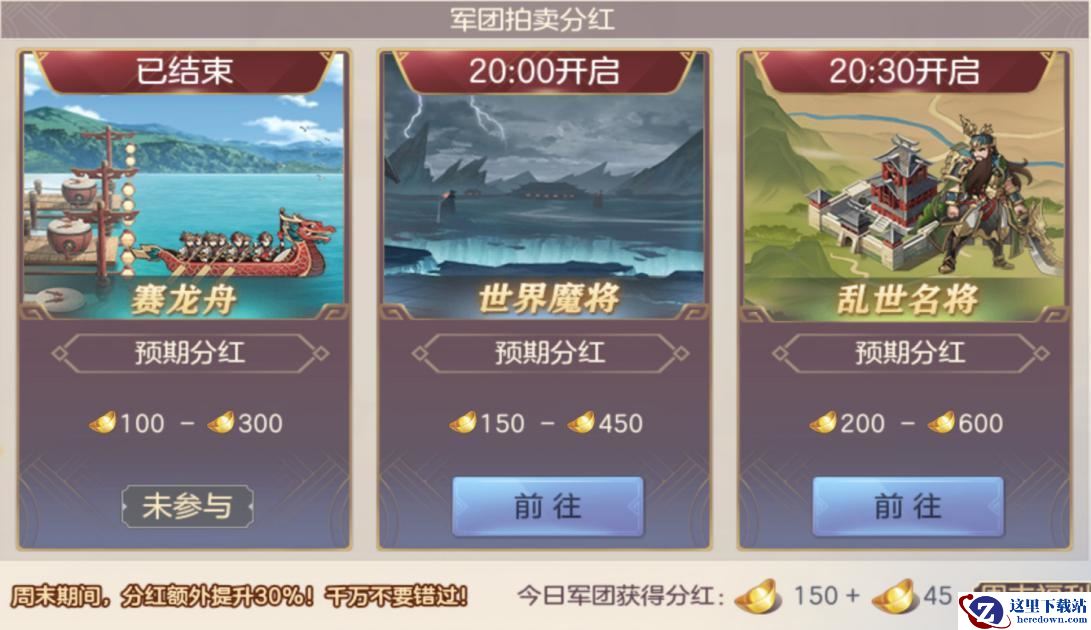 拍卖行中的竞拍物资只能通过参加军团活动获得,获得的物资会转移到军团拍卖当中,每个军团成员都可以参加(包括未参加军团活动的成员),拍卖行会给所有军团成员进行元宝分红(未参加军团活动的成员无法获得),分红的比例按照划定的范围,有上限。另外在周末还能够提升额外30%的分红加成,这是周末的福利。