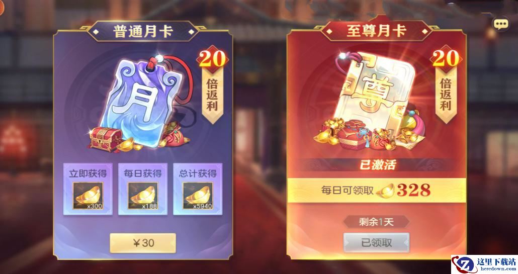 普通月卡:购买立即获得300元宝,每天领取188元宝,持续30天,总计5940元宝。