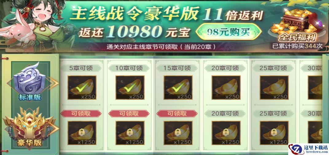 战令分为主线战令和秘径战令。每个战令都是需要靠玩家通关相应的关卡之后才能够进行领取元宝的福利。它分为标准版和豪华版,标准版本是每个玩家都可以免费领取的,豪华版本是需要购买才能够领取的,全民福利主要看本服所有购买的人数,也可以领取相应的福利。豪华版本单个副本获得5倍返利,总计11倍返利。每个战令分为多阶,每一阶都需要进行购买。